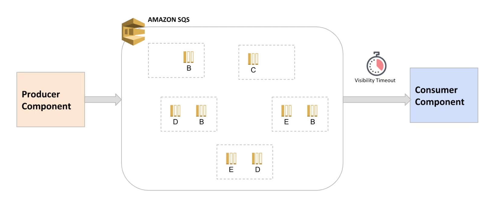 - You can set visibility timeout, a period of time during which Amazon SQS prevents other consumers from receiving and processing the message (Min: 0 sec, Max: 12 hours, Default: 30 secs).